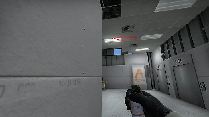 Целимся в полосу на полотке, которая пересекается с работающей лампой. Кидаем смок спустя пару шагов.