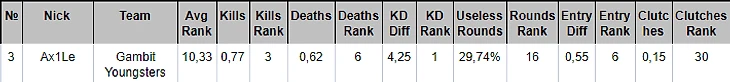 Третье место среди рифлеров чемпионата и абсолютно выдающиеся показатели убийств заставляют задуматься о том, насколько крутых масштабов исполнителем способен стать Аксель, если не снизит требования к себе. Прямо сейчас он является одним из самых перспективных игроков на СНГ-сцене.