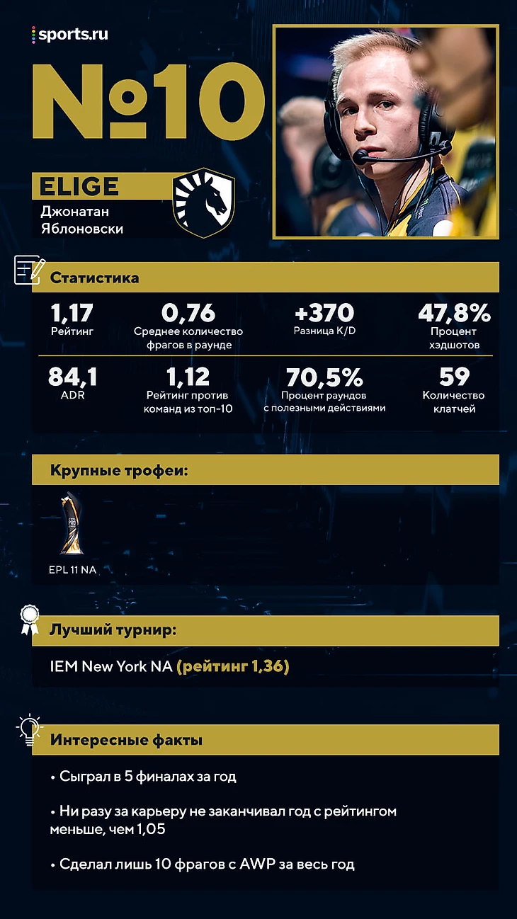 Мы начинаем топ с небольшого читерства и делим 10-е место между сразу несколькими игроками – Гримом, Элиджем и Юри. Дело в том, что именно эти три игрока из Америки показали лучший результат в 2020 году. EliGE второй год подряд выдал невероятно стабильную игру, Yuurih вырвался из тени KSCERATO и HEN1, став лучшим игроком Furia, а Grim вообще удивил весь мир, совершив невероятный прорыв из тир-3 команды из США до легендарного состава Liquid.