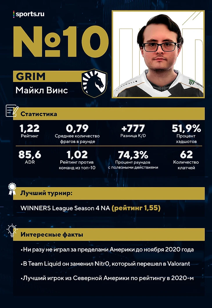 История Грима вообще заслуживает отдельного упоминания. В 2020-м малоизвестный игрок из третьесортных команд Америки сделал невероятный рывок и поднялся в топ. В США Гриму вообще не было равных, он уничтожал все команды вне зависимости от их статуса и популярности. Его рейтинг 1,22 – лучший среди всех игроков из Северной Америки. И хотя в Европе у новичка пока что не все идет гладко (отрицательный рейтинг на двух последних чемпионатах), сомневаться в его успешном будущем не приходится.