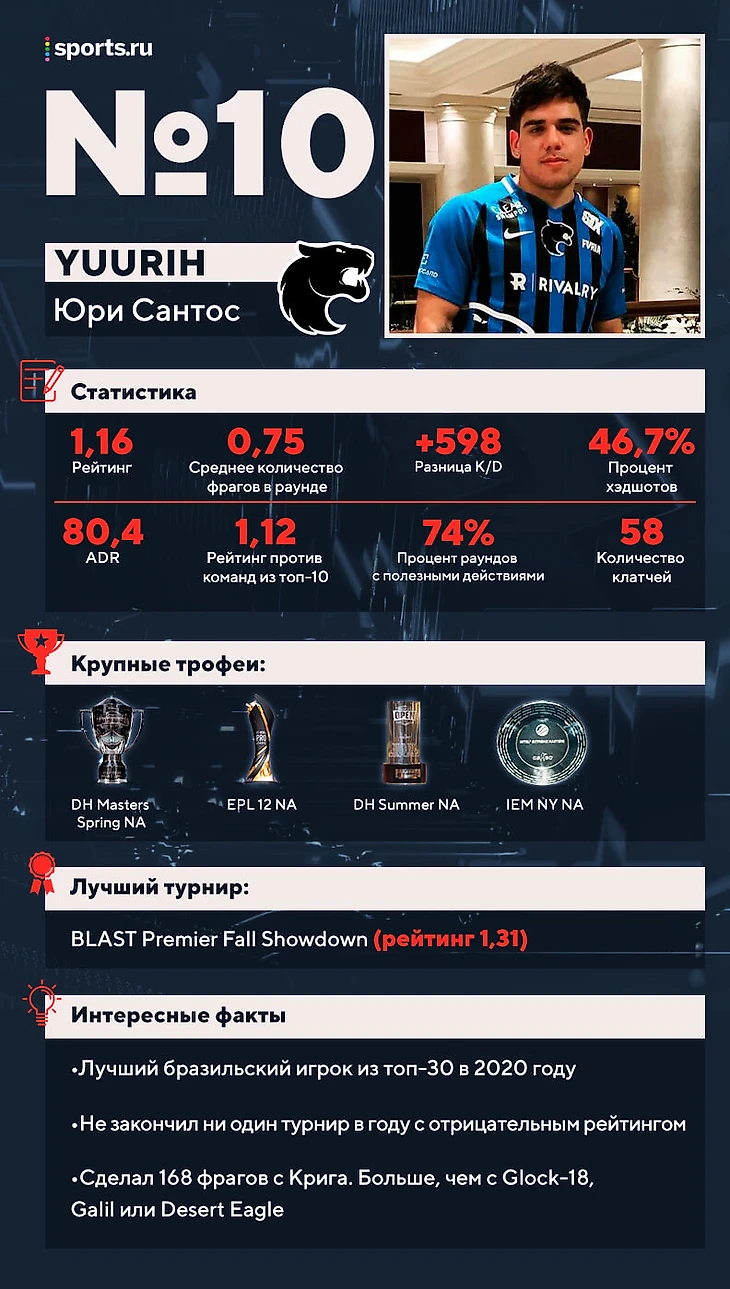 Yuurih тоже провел потрясающий год, выиграв почти все крупные турниры в Америке и став лучшим бразильским игроком года. Это невероятно, ведь еще год назад главными звездами Furia считались KSCERATO и HEN1, однако Юри за один сезон доказал, что способен тащить не хуже более известных тиммейтов.