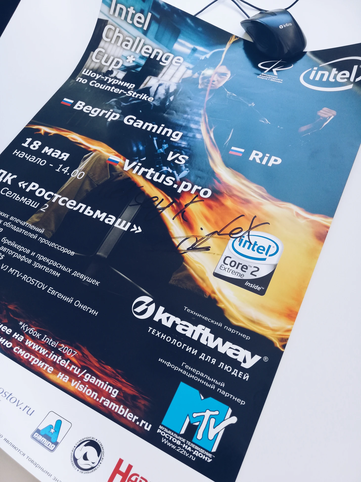 Лежит плакат с автографом легендарного игрока Алексея "Lex" Колесникова с шоу-матча команды Virtus.pro золотого состава по Counter-strike 1.6 который состоялся в 2007 году. Бумага плотная, глянцевая, хорошего качества, без заломов и складок. Размер А2. Готов продать, кому интересно пишите в ЛС или на мой твич https://www.twitch.tv/canmystyle