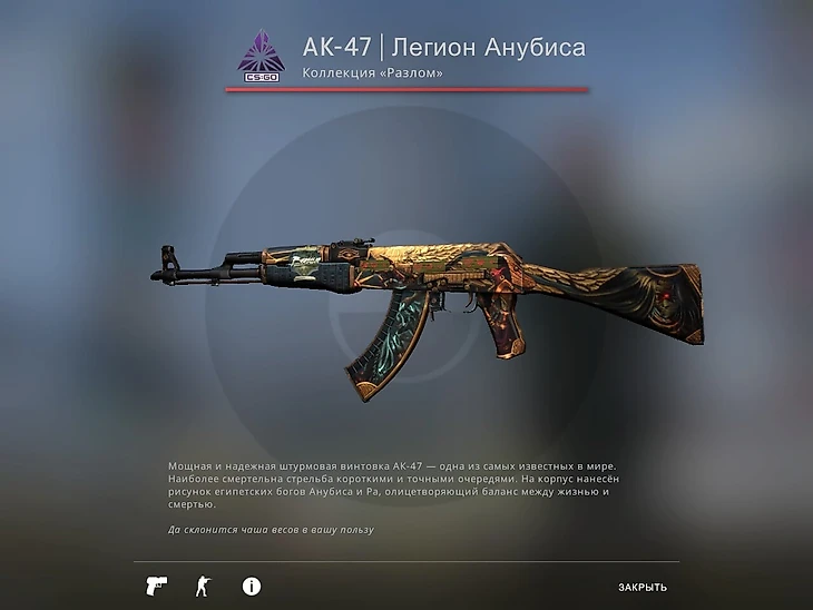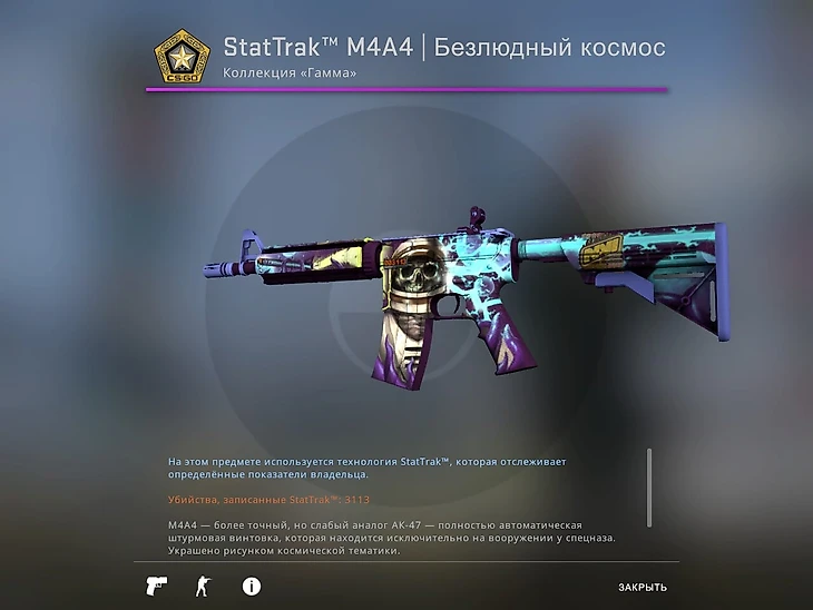 AK-47 Легион Анубиса и M4A4 Безлюдный космос – единственные скины из коллекции Бумыча, на которых изображен полноценный рисунок, а не просто смесь разных цветов. Эмка в качестве «прямо с завода» стоит 7 тысяч рублей, с нее Кирилл убил более 3 тысяч человек. Калаш стоит дешевле – всего 1500 рублей, качество «немного поношенное». На нем наклеены 3 золотых наклейки Здоровье, каждая стоит тысячу рублей и золотой автограф Бумыча за 1,5 тысячи рублей.