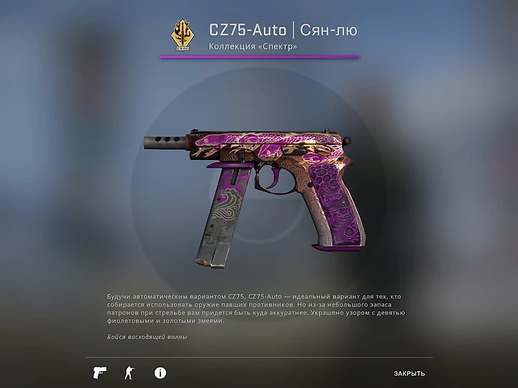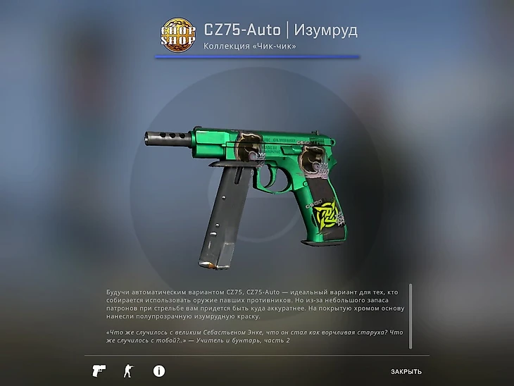 CZ75 Изумруд и Сян-лю за 550 и 420 рублей соответственно. С первой очень красиво смотрятся наклейки Фурии. С бразильской командой Чешку связывает и именной ярлык «art». Это никнейм одного из игроков.