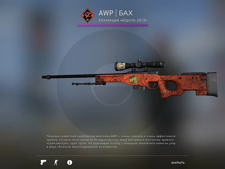 AWP Бах за 4 тысячи рублей с голографическими наклейками NAVI и Взрыв. Еще один скин из 2013 года. Обе наклейки классно выглядят на оранжевом скине. Также есть именной ярлык «flamieking».