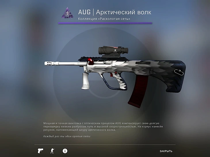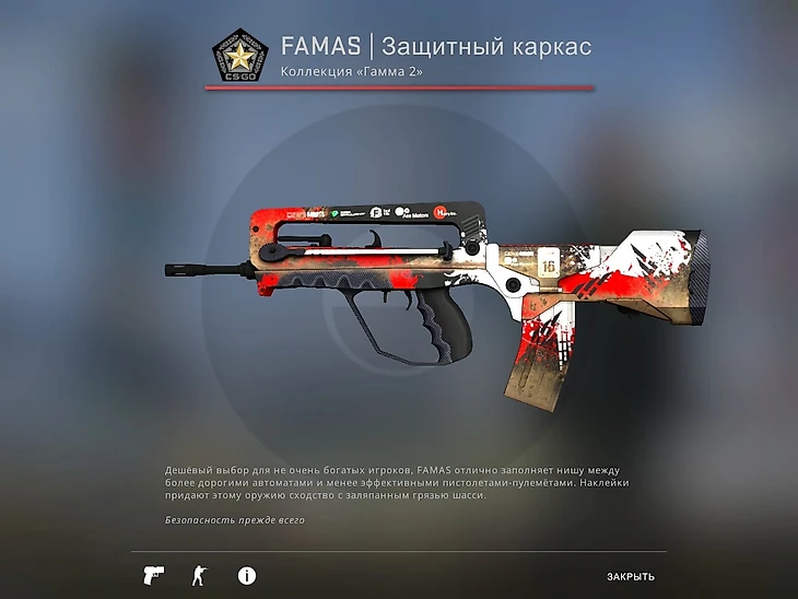 Из дешевых скинов внимания также заслуживает AUG Арктический волк за 430 рублей. На скине очень хорошо сочетаются белый, серый и черный цвет. Также красиво выглядит и FAMAS Защитный каркас за 460 рублей, который напоминает раскраску гоночного болида. Оба скина в качестве «прямо с завода».