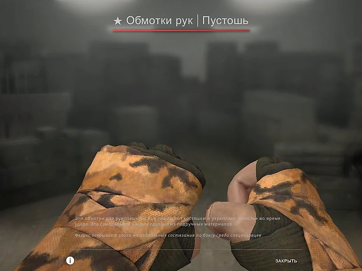 Единственные перчатки Бумыча – Обмотки рук Пустошь за 75 тысяч рублей. Про них также нельзя сказать ничего интересного, а их цена обусловлена тем, что они выпадают из дорогих кейсов: перчаточного (стоит более 150 рублей) и Гидры (стоит более 700 рублей).
