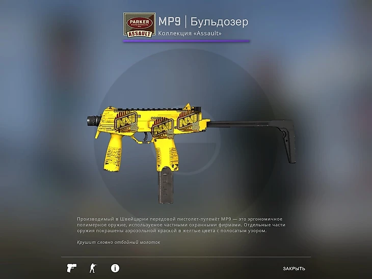 MP9 Бульдозер за 7 тысяч рублей. Очень редкий скин из коллекции Assault. На нем есть 3 наклейки NAVI, которые очень хорошо сочетаются с желтым скином.