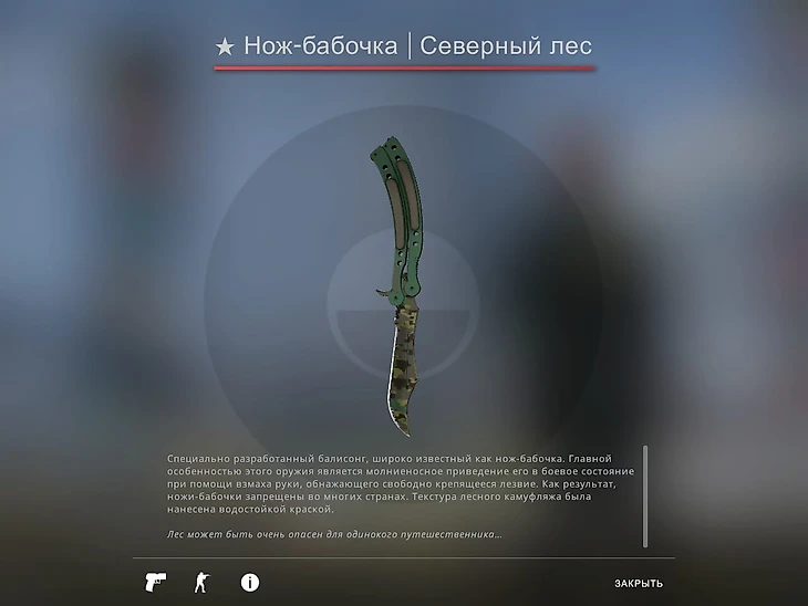 У Кирилла обычный нож-бабочка Северный лес за 40 тысяч рублей в качестве «немного поношенное». Очень скучный скин, столь высокая цена которого обусловлена лишь интересными анимациями бабочки.