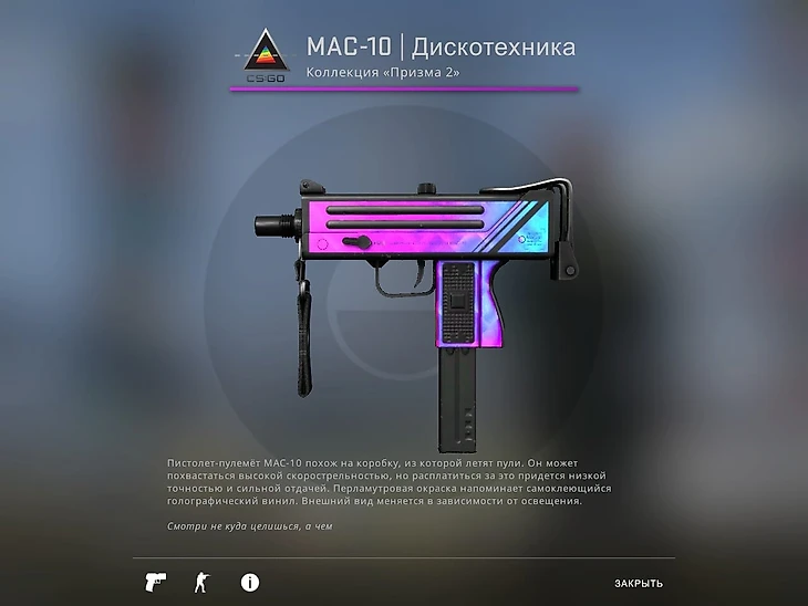 Из интересных скинов можно отметить два MAC-10: Ядерный сад в качестве «прямо с завода» с наклейками Блейда, Маркелова и ВорлдЭдита за 500 рублей и Дискотехники «после полевых» за 250 рублей. Первый отлично смотрится в сочетании с золотыми стикерами, а второй отдаленно напоминает градиент, на нем также очень красиво переливаются цвета.