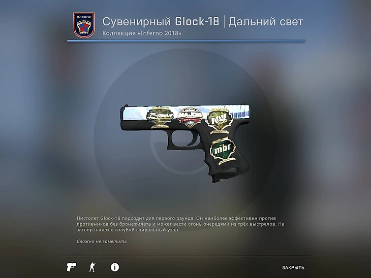 У Кирилла также есть 2 Glock-18. Первый – сувенирный Дальний свет с мейджора из Берлина и его автографом за 418 рублей, а второй – Реактор «прямо с завода» с интересным паттерном за 580 рублей.