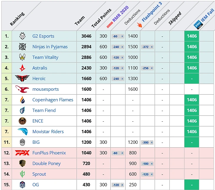 На данный момент наименьшие шансы у Astralis – им нужно отыграть около 450 RMR очков у Vitality / NiP, либо 600 у G2. Для этого необходимо проходить далеко по сетке и ждать итогового низкого места в плей-офф на отборочном турнире кого-то из оппонентов.