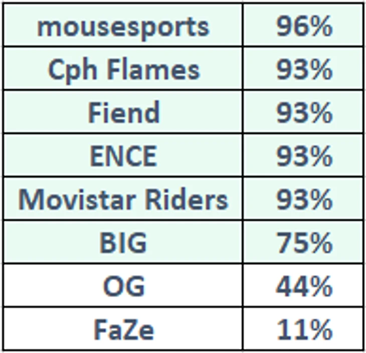 «Мышки» – единственная команда из списка, которая не вышла из группы. Ропз и компания не играют в плей-офф, однако за счет набранных RMR очков (шли на третьем месте до старта турнира) практически гарантировали себе место на мейджоре. Они не проходят только при одном почти фантастическом раскладе: