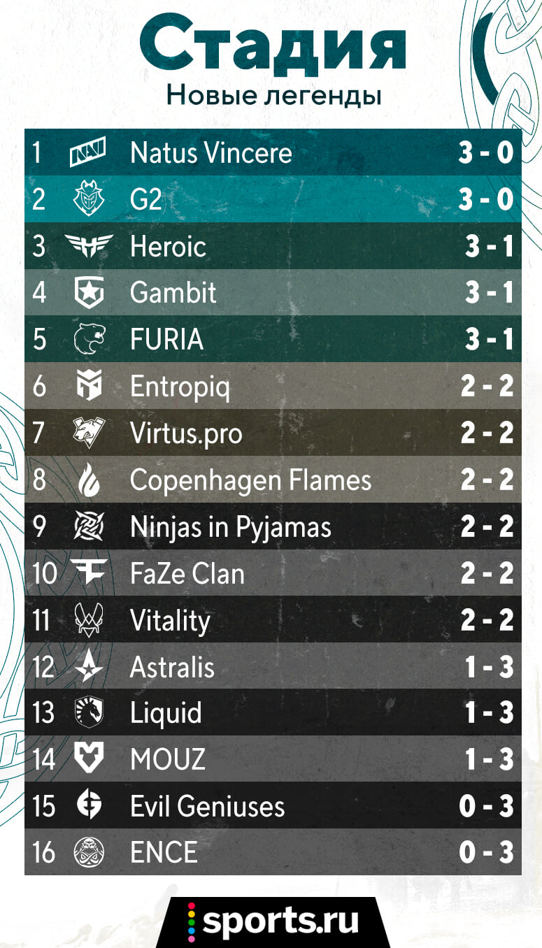 • Heroic, Gambit и Фурия вышли из группы со счетом 3-1. В решающей встрече Хероик выиграла в датском дерби у Copenhagen Flames, Gambit разгромила NIP, а Фурия обыграла Entropiq.