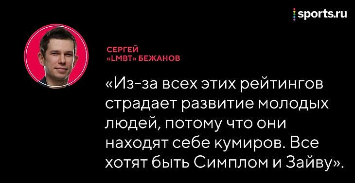 – Мне этот рейтинг не нравится. Это очень расхайпленная тема. Из-за всех этих рейтингов страдает развитие молодых людей, потому что они находят себе кумиров: все пытаются играть на одной роли. Если ты возьмешь FPL-C, FPL, откуда раньше брали топовых игроков, – все пытаются играть с AWP. Потому что два лучших игрока в мире – Симпл и Зайву. Все хотят быть Симплом и Зайву. В итоге происходит перенасыщение кадрами, и таких игроков, как Санжи, например, не хватает.