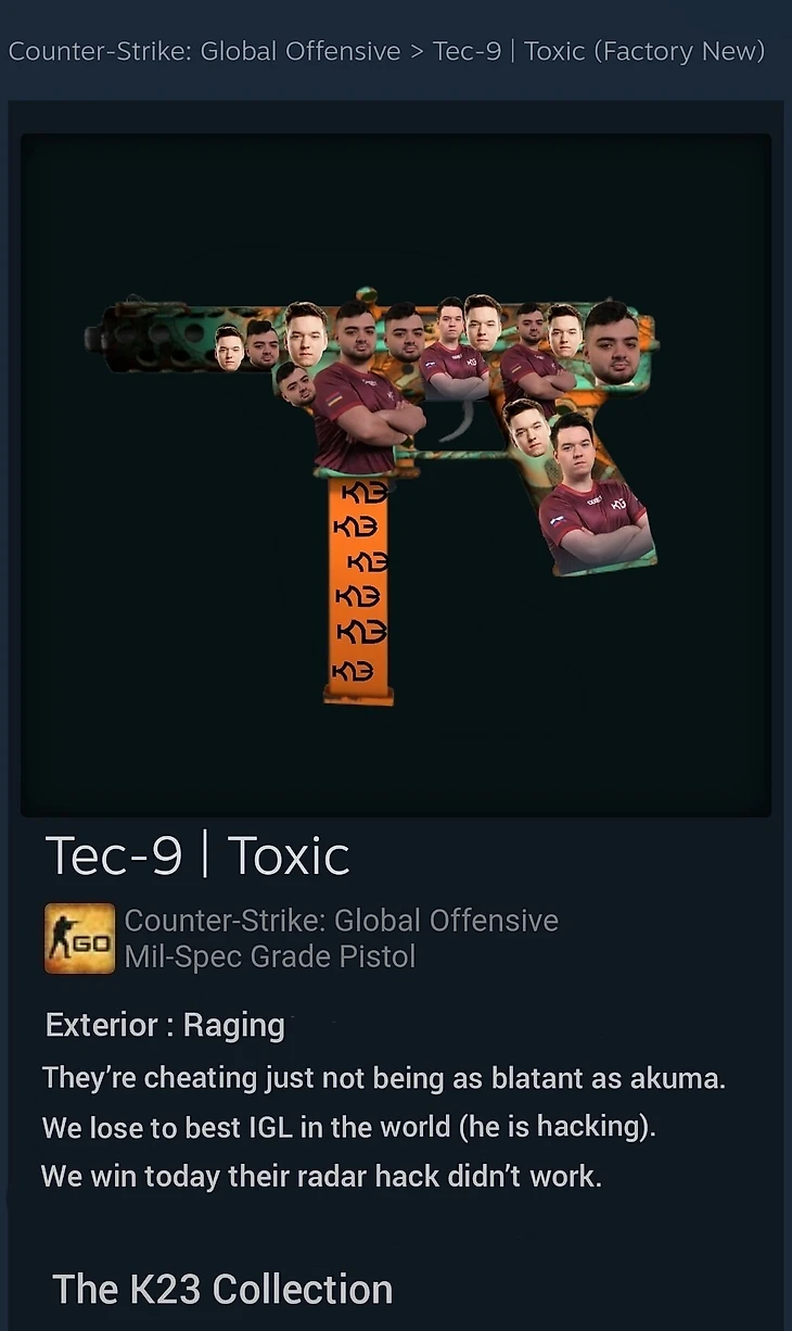 В ответ на такое обвинение Estatic выложила в твиттер скриншот со скином Tec-9 Toxic, прифотошопив на него лица Норберта и Ксепавера, которого тоже считают токсиком.