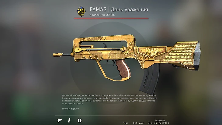 На большинстве пушек у него вполне обычные скины за несколько тысяч рублей. Например, золотой Famas за тысячу рублей в качестве «прямо с завода». На нем есть именной тег «Bandurka», отсылающий к бывшему тиммейту Виктора по Spirit – Диме Бандурке.