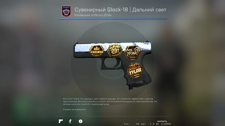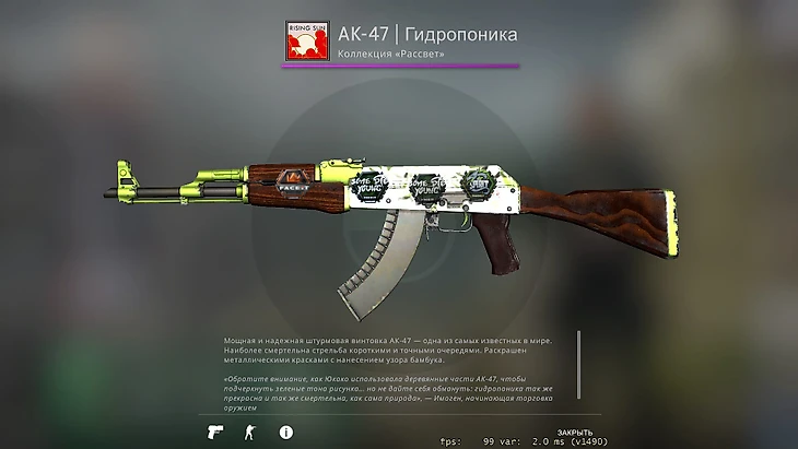 В инвентаре Sdy очень много скинов, напоминающих о его бывшей команде. Зеленый AK-47 «Гидропоника» за 80 тысяч рублей с его автографами, наклейками Spirit и мейджора в Лондоне – первого чемпионата мира, на который он попал. Качество пушки – «немного поношенное».