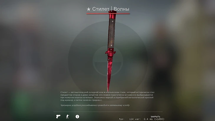 Первый его нож – Стилет «Волны» в редком паттерне Рубин за 160 тысяч рублей. Качество скина – «прямо с завода».