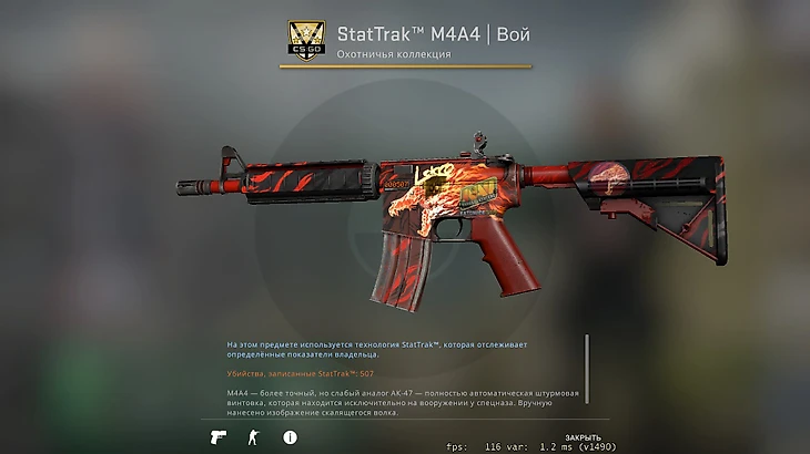 Второй по стоимости скин в коллекции Sdy – эмка «Вой». Любой экземпляр этого скина обойдется совсем не дешево, но Виктор купил самый дорогой вариант: с установленным счетчиком убийств StatTrak, в качестве «прямо с завода», да еще и с голографической наклейкой NAVI с первого мейджора. Такой скин стоит более 2 миллионов рублей.