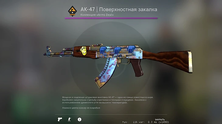 Самый дорогой скин в коллекции Виктора – AK-47 «Поверхностная закалка». Сам по себе он стоит всего 15 тысяч рублей, но на него нанесено 4 очень дорогих наклейки: одна металлическая Короны за 30 тысяч рублей и 3 голографических наклейки Titan с Катовице 2014 года. Каждая из них стоит более 1,4 миллиона рублей.