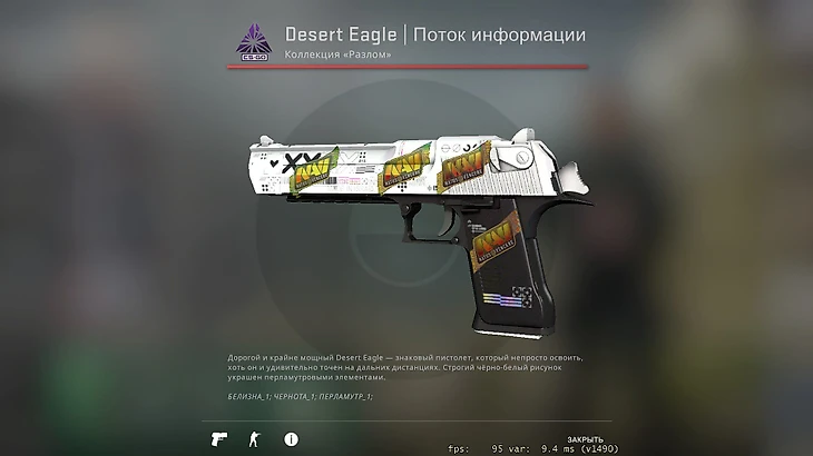 Но в инвентаре Sdy есть и более интересные скины. Например, красивый Deagle «Поток информации» за 7 тысяч рублей. Во-первых, такой скин в качестве «прямо с завода» красивый сам по себе, а еще круче он выглядит из-за четырех голографических наклеек NAVI с Катовице 2015 года. Каждая из них стоит более 30 тысяч рублей.