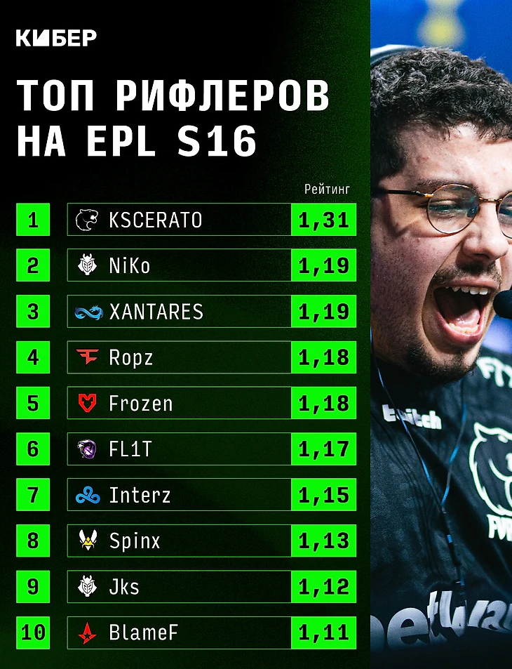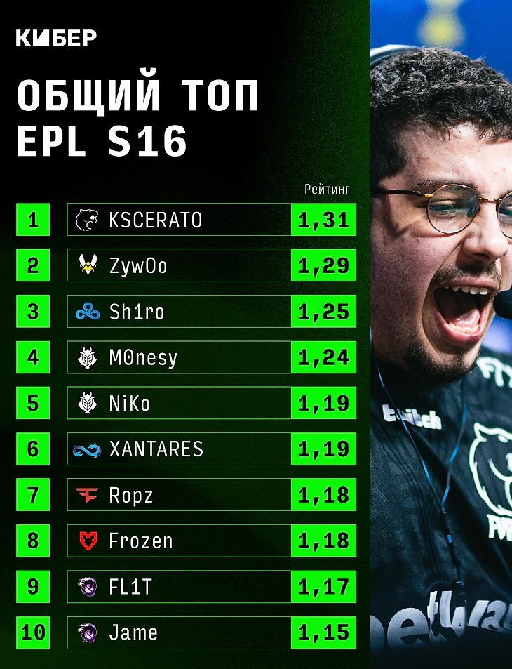 К счастью, после группового этапа EPL S16 сразу три команды из Восточной Европы прошли в плей-офф. Но по цифрам не у всех полный порядок. Посмотрите на рейтинг – много ли там игроков Team Spirit и NAVI?