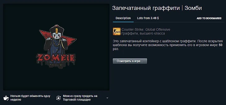 После матча Wings Up цена на граффити взлетела в несколько раз: с 60 до 320 рублей. Но сейчас цена немного упала до двухсот рублей. Выходит, что одно нанесение будет стоить 4 рубля. Впрочем, таких граффити сейчас очень мало, продается всего 54 лота. Вполне возможно, что в будущем на них будет дефицит.