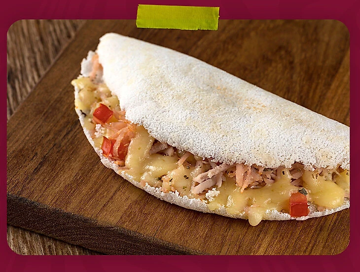 Тапиока – это такой начиненный блинчик. Но на русский блин он похож разве что круглой формой. В тесте лишь один ингредиент – крахмальная мука (эта мука и называется тапиокой). Никакого масла и яиц! Готовится элементарно – может, поэтому в Бразилии тапиоку так любят?