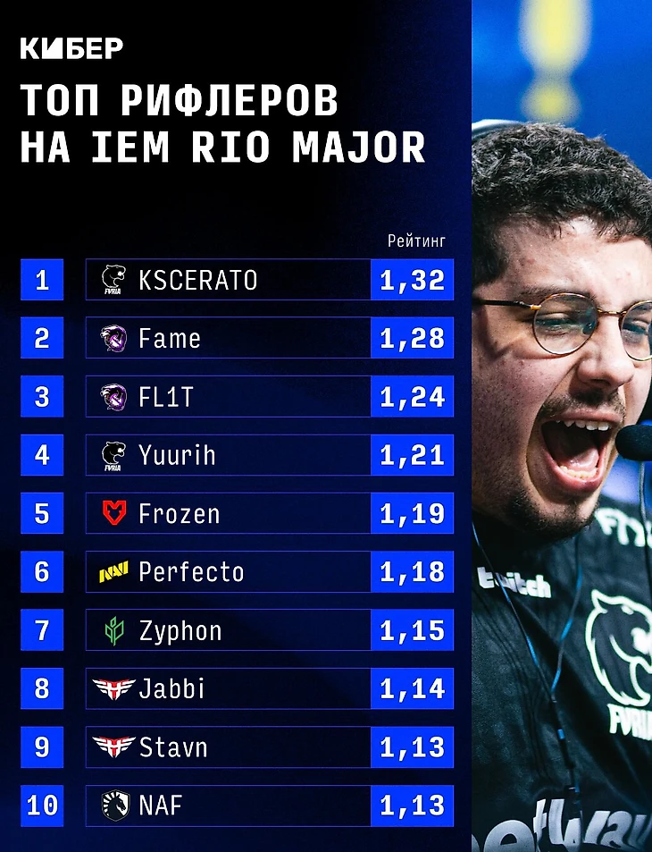 • Fl1t – 1,24. Удивительно, но IEM Rio Major – первый супертурнир, на котором Флит превзошел единицу. В Кельне были 0,92, в Антверпене – 0,97, а в Стокгольме – 0,996. Теперь же Евгений вошел в историю! И 1,24 – конечно, его лучший рейтинг Кибера.