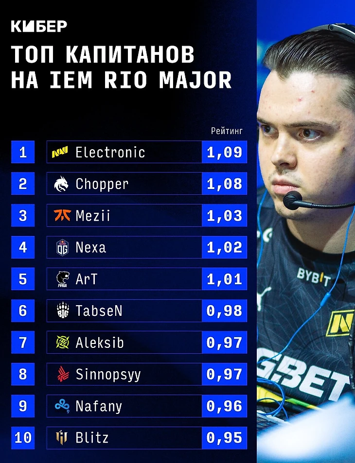 • Electronic – 1,09 (№28). Цифры Элека – американские горки, он дико нестабилен после перехода на IGL. Денис буквально не может отыграть два турнира подряд хотя бы на 1,15. И проблема не только в нем.