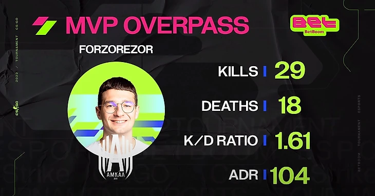 Ответочкой от STUDIO 21 стала пятерка в виде KHUDOSHIN, PCH3LK1N, SHDOWKEK, ZONER и DIRTYRAMIREZ86. На первой карте вера букмекера BetBoom была сильнее в АМКАЛ. Тем более, команда выбрала свой любимый Overpass. Коэффициент на победу АМКАЛ составлял перед первой картой 1.48, в то время как ставка на победу STUDIO 21 равнялась коэффициенту 2.50.