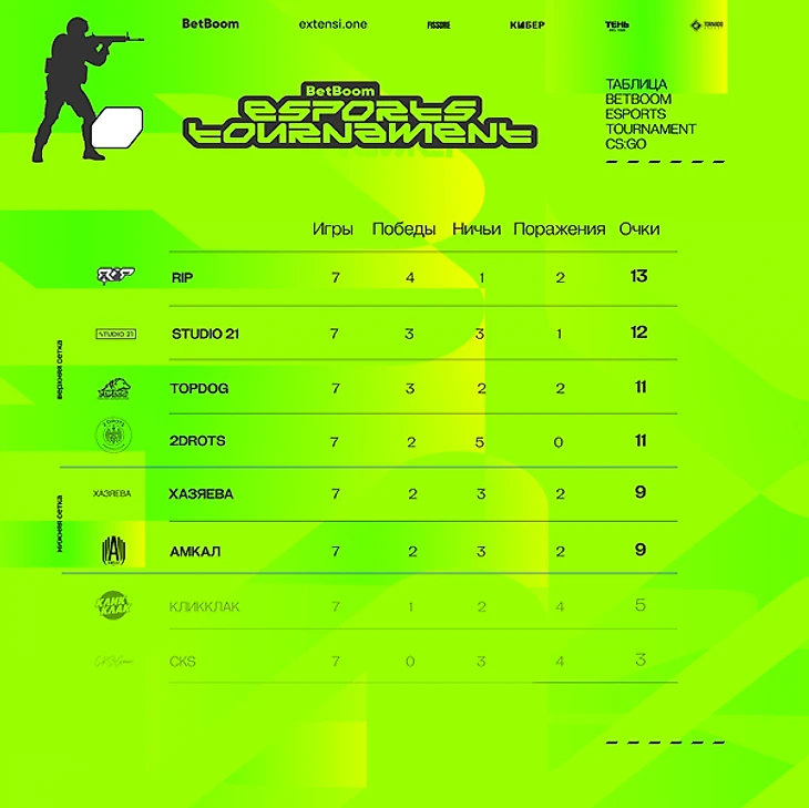 После сегодняшних игр определились все участники плейофф: RIP, STUDIO 21, TOP DOG и 2DROTS начинают в верхней сетке, а ХАЗЯЕВА и АМКАЛ стартуют в нижней. CKS и КЛИК КЛАК покинули борьбу в первом сезоне медиалиги BET.