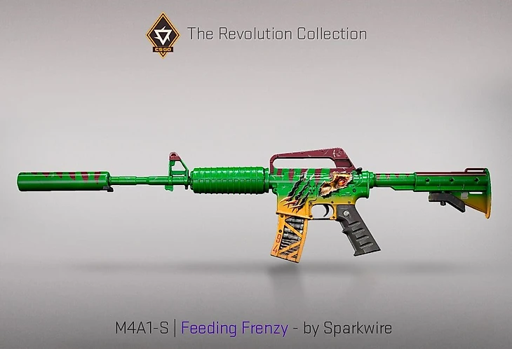 Спустя 7 месяцев после релиза последнего кейса Valve все-таки порадовала каэсеров новыми скинами. С обновлением в игре появился ящик «Революция» с 17 новыми раскрасками для оружия. К сожалению, новых ножей не завезли – из этого кейса выпадают только перчатки коллекции «Решающий момент».