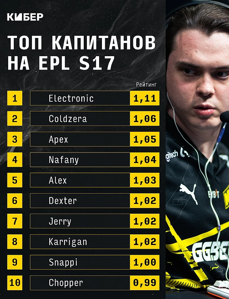 Примечание: снайперы – Cadian и Jame – не вошли в топ капитанов, потому что их основное оружие – AWP. Они учитывались в рейтинге снайперов, где заняли 13-е и 17-е место соответственно.