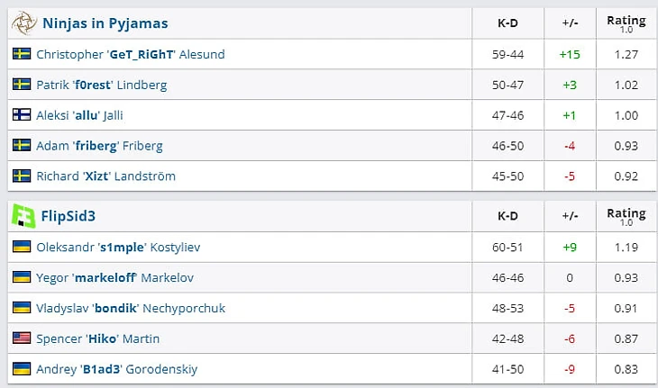 Так же сильно, как крики Симпла, Hiko поразила быстрая перезагрузка Костылева: «Он выглядел так, будто хотел кого-то ударить. Может, не меня, а в принципе. Прошло 5 минут, он сходил на улицу и был лучшим тиммейтом после этого. Но мы выигрывали раунды. Если бы нас снова разнесли, возможно, я бы уже был мертв», – смеясь, рассказывал Спенсер. А раунды Flipsid3 действительно выигрывала: на двух следующих картах шведов переехали. Статистика матча – классика. Симпл на первом месте, и больше ни одного тиммейта в плюсе.