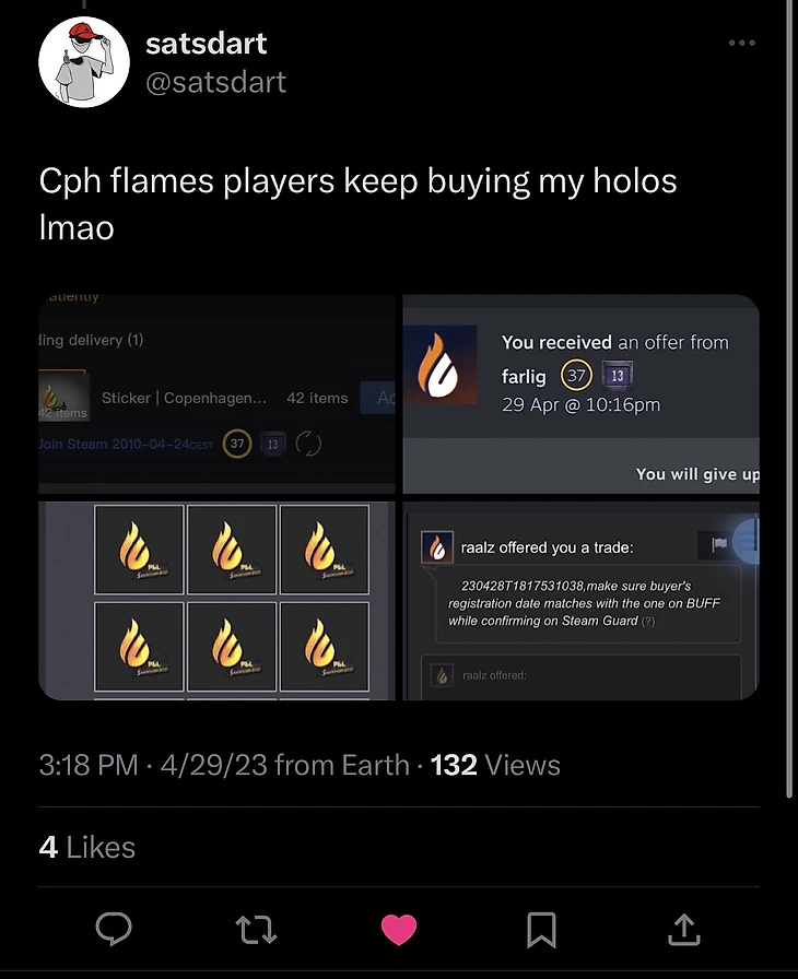 После сообщения о банкротстве наклейки Copenhagen Flames быстро взлетели в цене: версия с Антверпена выросла с двух до 24 рублей, а со Стокгольма – с 9 до 45. Игроки, у которых в инвентарях было много стикеров, зафиксировали большую прибыль. Кто-то и вовсе успел закупить наклейки по рублю еще 2 года назад.
