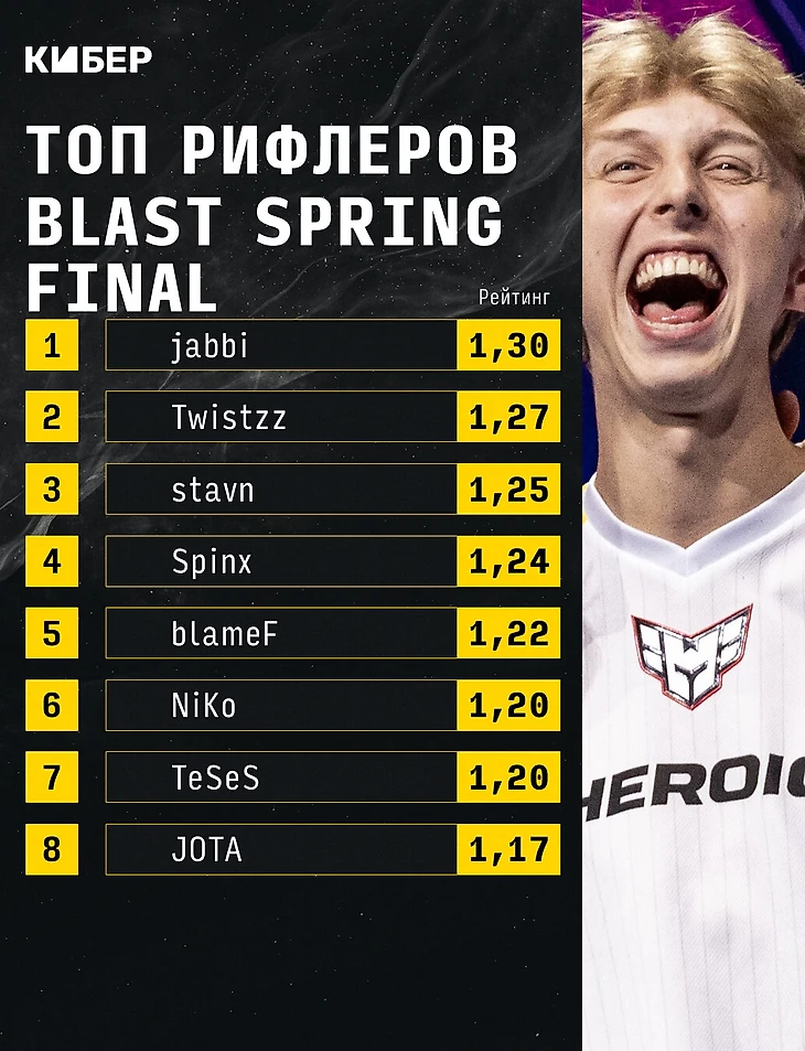 Закончился последний турнир первой половины сезона – BLAST Premier Spring Final 2023. Heroic наконец-то выиграла после серии поражений в финале Катовице и Рио, полуфинале Далласа и мейджора. Лучшим игроком турнира стал капитан и снайпер Heroic – Cadian с рейтингом 1,36.