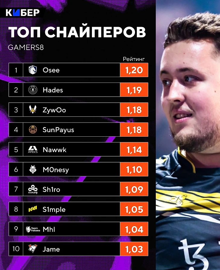 • Два лучших игрока турнира по рейтингу – Osee и Hades – сыграли лишь по одному матчу, поэтому считать их MVP неправильно. На третьем месте Zywoo с рейтингом 1,18 – Матье вновь стал MVP турнира (вторая награда для него после мейджора в Париже). У SunPayus и Niko также рейтинг 1,18, но до округления они были ниже француза: