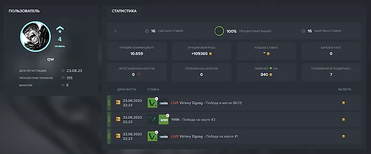 23 августа 2023 года – в первый день закрытых квалификаций на IEM Sydney 2023 – на одном из сайтов для ставок появился новый профиль. Его лучший выигрыш – почти 110 тысяч рублей (с одной ставки), лучший коэффициент – 10.659. И три ставки в профиле – все на встречу VZ с 1Win. Еще 13 ставок скрыты, однако винрейт 100 дает понять, что пользователю явно очень везло.
