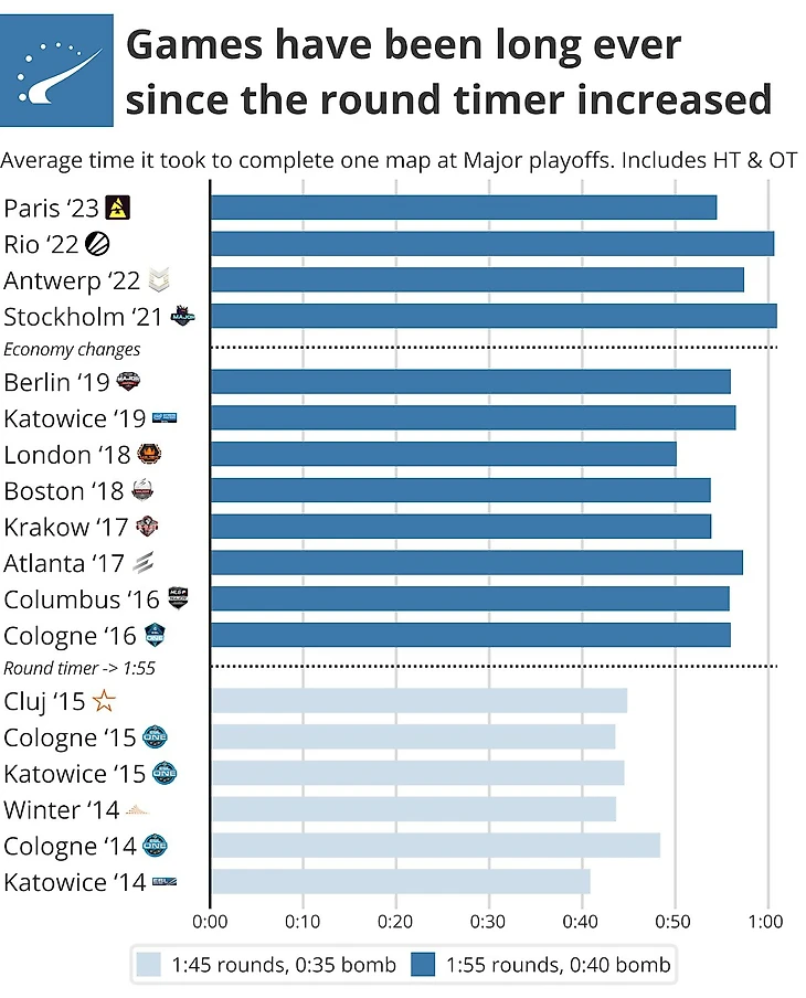 С развитием CS:GO продолжительность игр только росла, потому что в 2015 году изменили время раунда (с 1:45 до 1:55) и время до взрыва бомбы (с 35 секунд до 40).