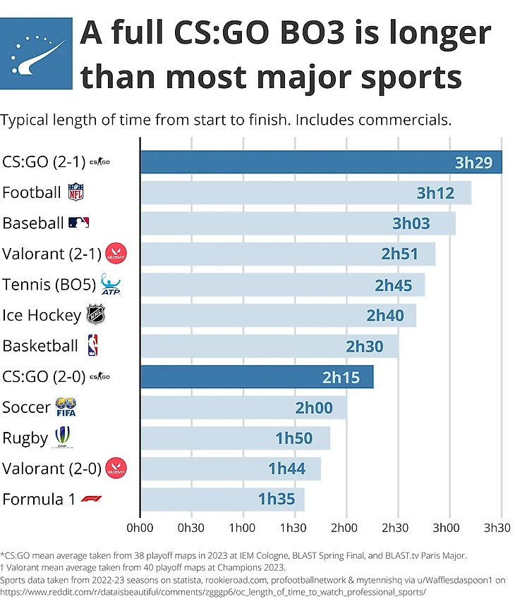 Да, главное – сократить длительность матчей. Потому что в CS они и правда идут вечность – в среднем 3,5 часа, если в Bo3 сыграли три карты. Это дольше, чем в американском футболе, бейсболе, Valorant (там тоже MR12), теннисе, хоккее, баскетболе, футболе, регби и «Формуле-1». Короче, везде.