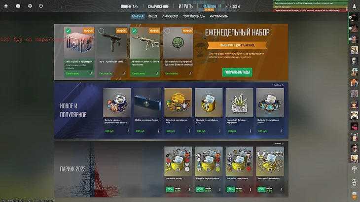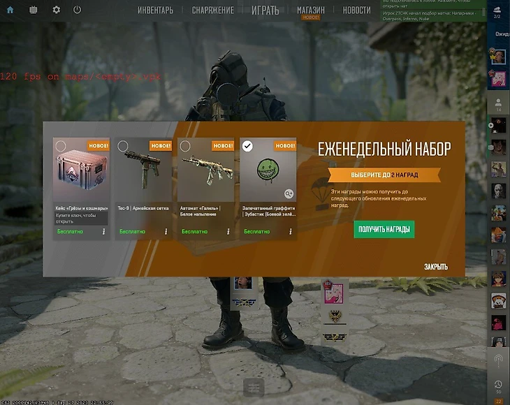 Раз в неделю за повышение уровня игрок будет выбирать из четырех предметов – кейсов, скинов и граффити. Судя по скриншотам из соцсетей, всем игрокам предлагается 1 кейс, 2 пушки и 1 граффити. Получить можно два любых предмета. Окно с предметами появляется сразу после матча в главном меню.