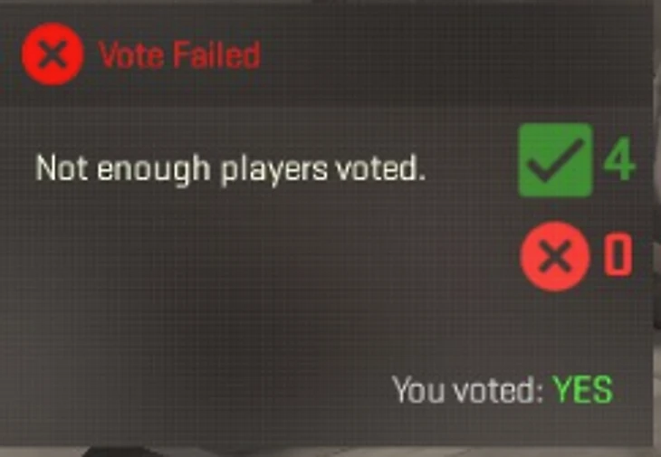 Но есть и другая проблема – разработчики, добавляя новую систему, умудрились сломать старое голосование. Раньше его также можно было начать, только когда кто-то вышел из игры и получил блокировку, а для завершения матча необходимо было набрать 4 голоса за. Теперь же при запуске такого же голосования при наборе четырех голосов за игра пишет, что в нем приняло участие недостаточное количество игроков.
