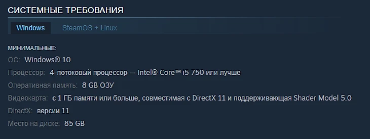 Согласно информации на официальной странице игры в Steam, КС 2 требуется 85 гигабайт на жестком диске.