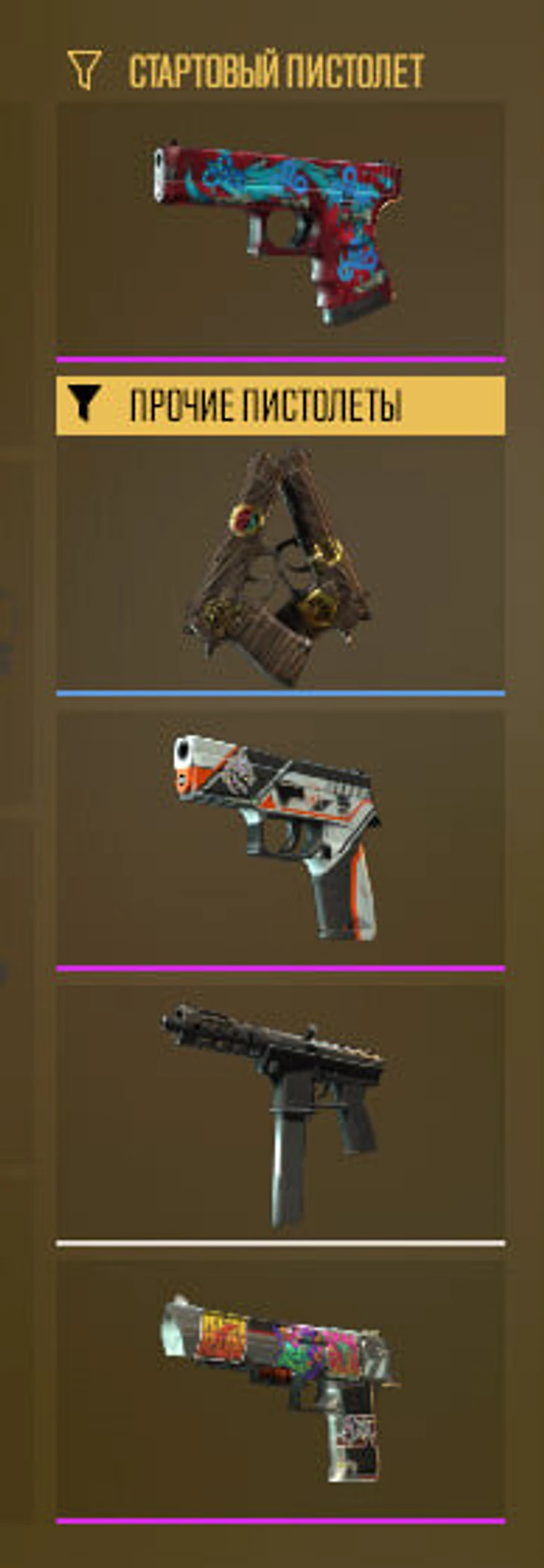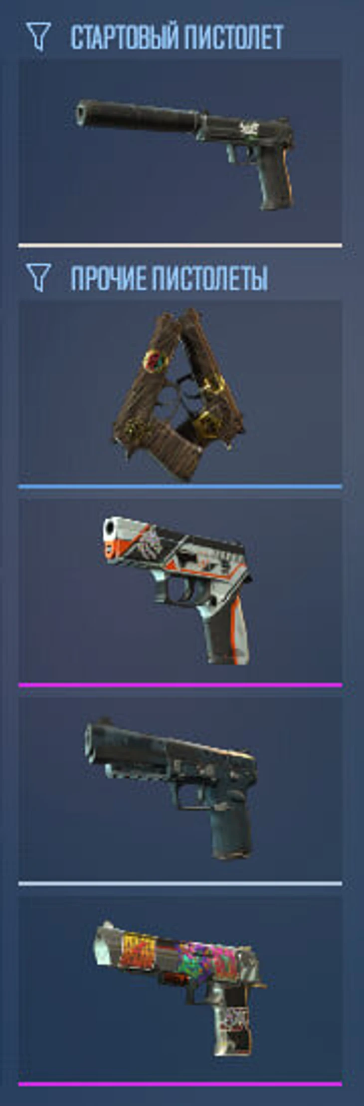 То же самое, только дефолтный USP-S меняется на дефолтный Glock, а вместо Five-Seven появляется Tec-9, с которым очень удобно быстро залетать на точки – точность движения позволяет.