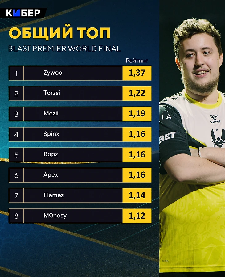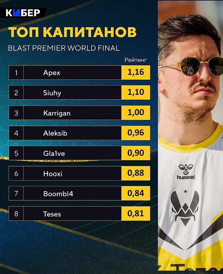 ● Vitality показала невероятный уровень. Помимо недостижимого рейтинга 1,37 от Зайву, все вошли в восьмерку лучших игроков, а Apex стал сильнейшим капитаном с 1,16. Кроме игроков Vitality в топ-8 попали Torzsi (1,22), Ropz с 1,16 и Монеси с 1,12.