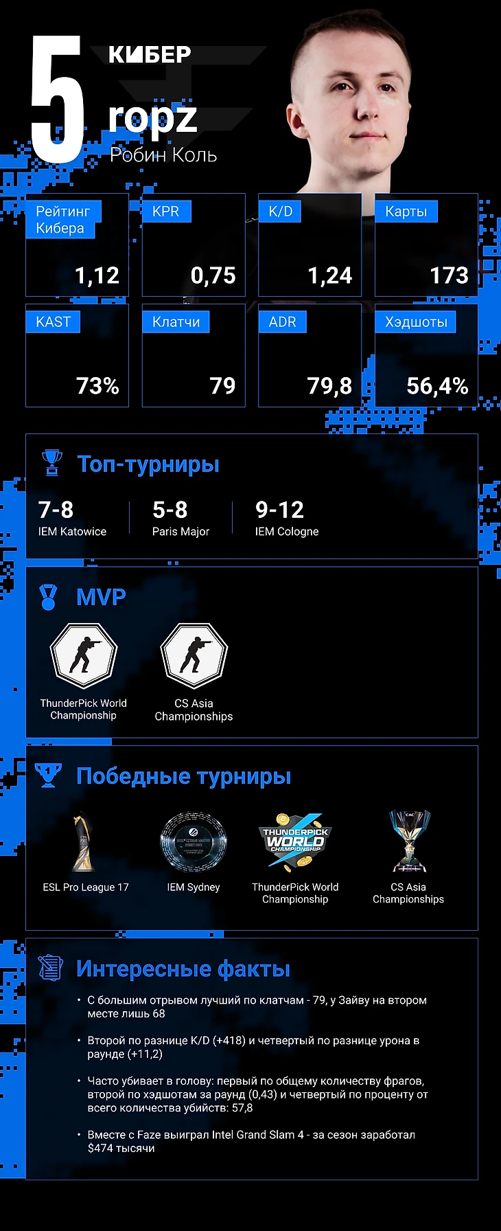 Если в прошлом году мы считали Faze командой из четырех равных по силе игроков, то в 2023 году Ропз стал очевидным лидером и локомотивом состава. Из-за этого он занял место выше, чем Spinx, который оказывал меньшее влияние на победы Vitality.