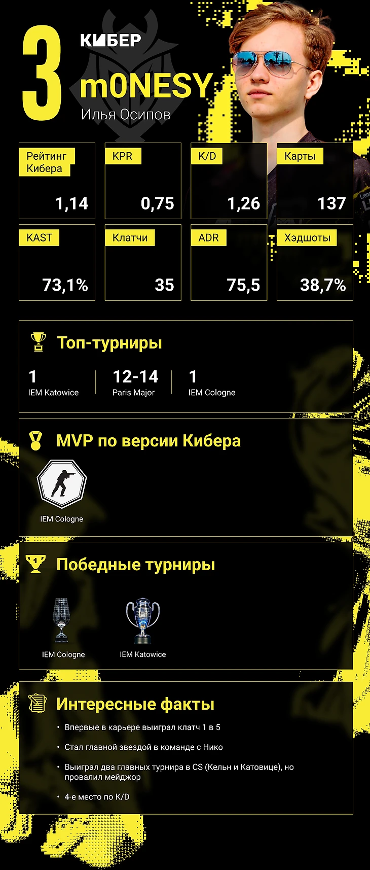 K/D – 1,26, тут Монеси четвертый. Третье место – по количеству энтри-фрагов на крупных турнирах (330) и количеству энтри за раунд (0,13), второе – по проценту выигранных стартовых дуэлей (65,1%).