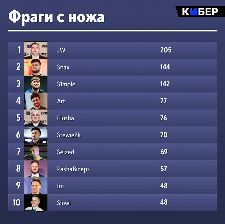 8 игроков не сделали ни одного фрага с ножа. Среди известных – Jimpphat из Mouz и Headtr1ck из NIP. 4 фрага у Блейма, всего один у Спинкса, 2 у Донка, 6 и 9 у Перфекто и Электроника. Всего 6 убийств у M0nesy.